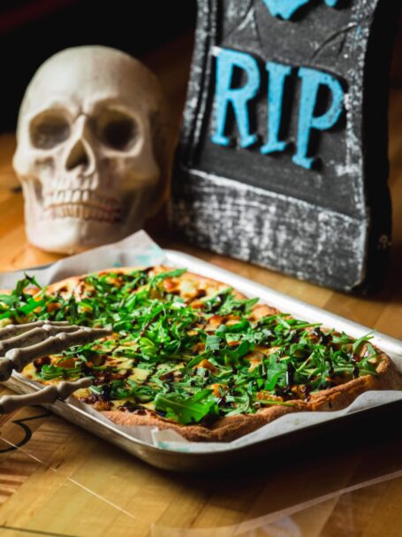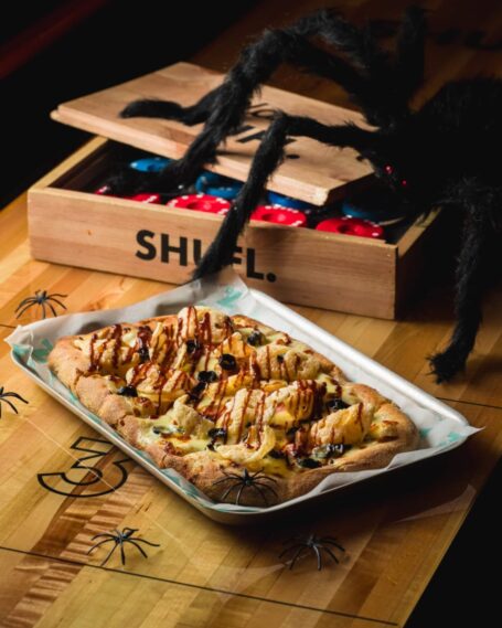 olive oil, creme fraiche, mozzarella, pulled veggie duck, buffalo sauce, parade, gochugaru pepper