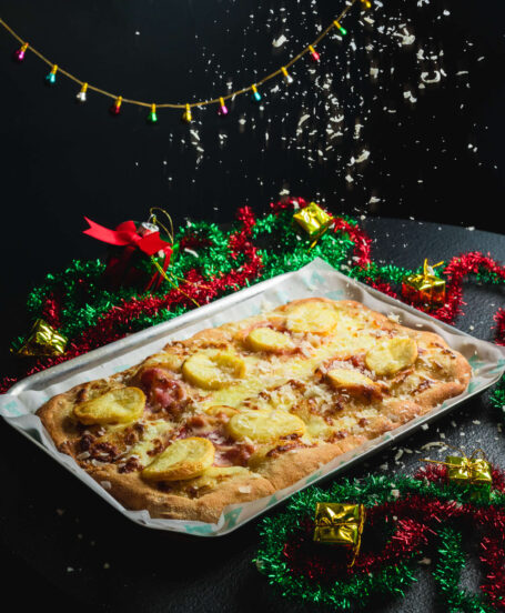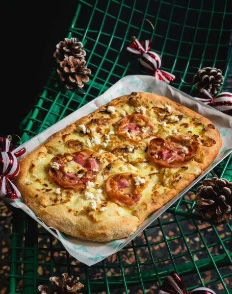 oliwa z oliwek, crème fraîche, mozzarella, duszona cebulka, sól truflowa, pancetta, twaróg wędzony